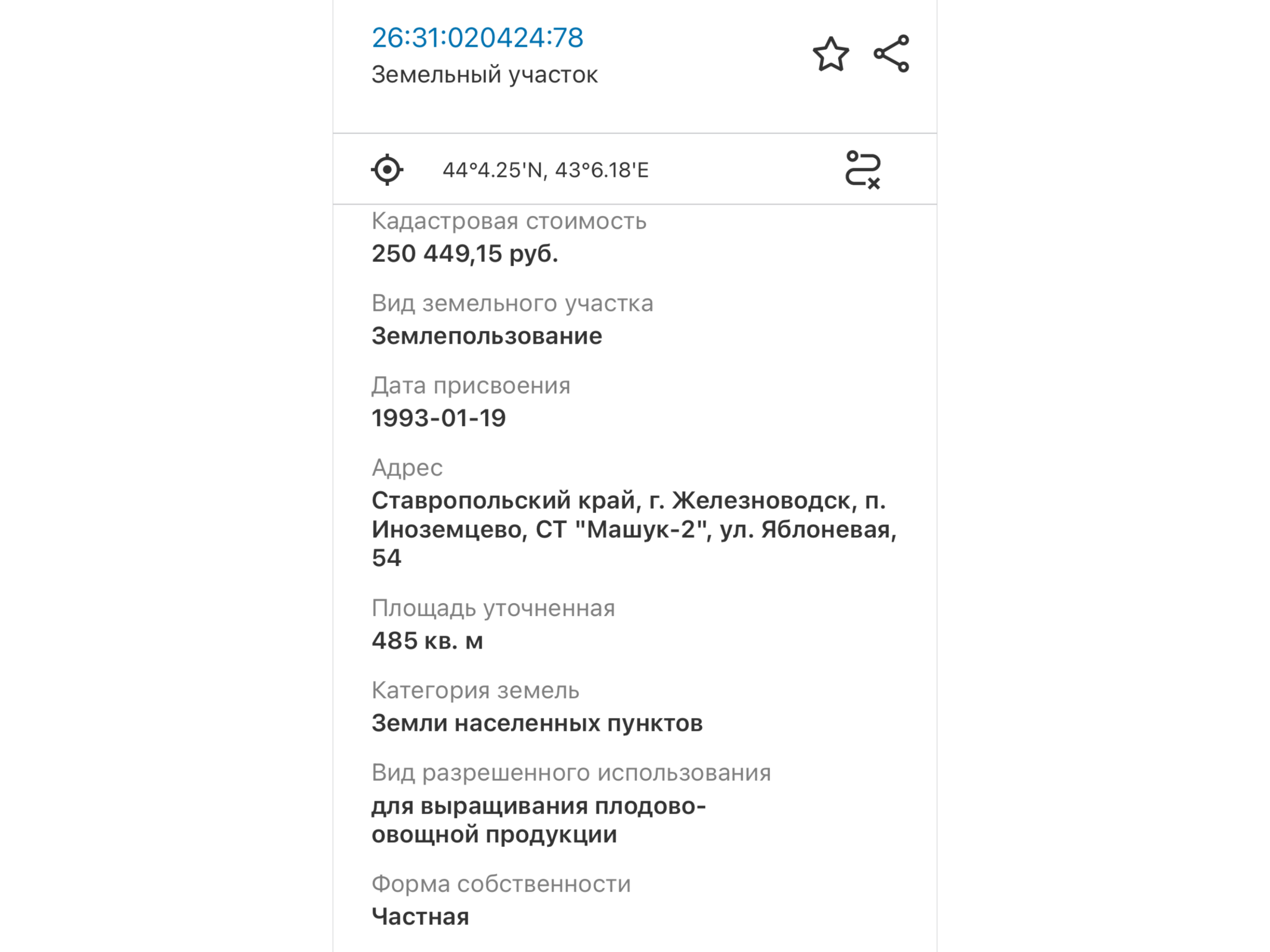 Кадастровый номер участка26:31:020424:78